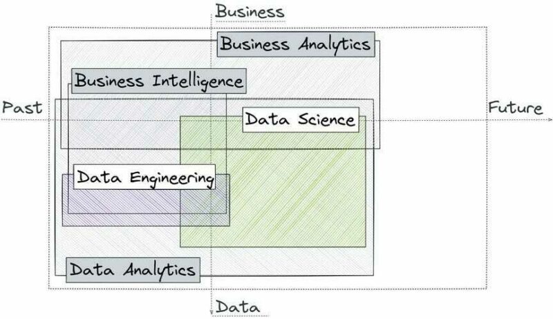 On our scale, data engineering intersects with business intelligence, as it uses data engineering outputs to provide insights and knowledge to business leaders. At the same time, data engineering enables the collection and storage of data that business intelligence can use.