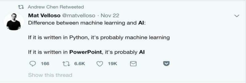 One of the best ways to show the difference between machine learning and artificial intelligence can be shown with the following tweet:
